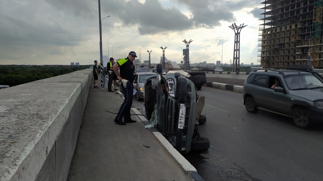 В соцсетях появилось видео вчерашней аварии на метромосту около съезда на улицу Фрунзе (в районе нового корпуса ОмГУ). Судя по этим кадрам, водитель автомобиля наехал на левый бордюр, машина повалилась набок, пролетела проезжую часть и остановилась около правого бордюра.
