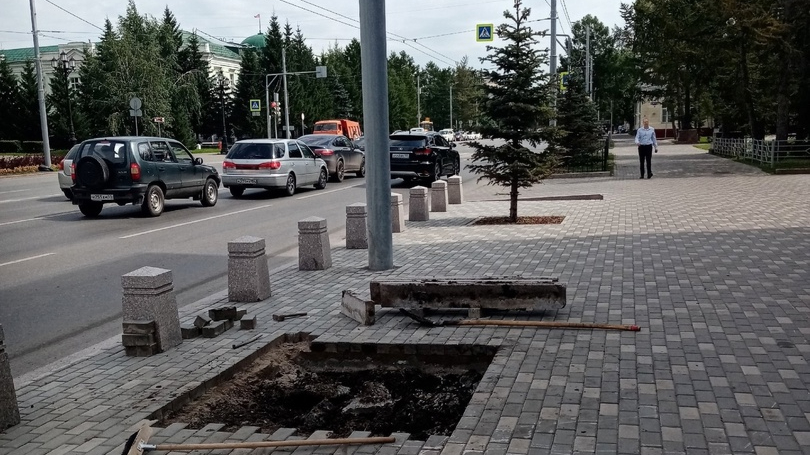 Около здания ФСБ в Омске (Ленина, 2) выкорчевали сухие ели. Как сообщают в соцсетях горожане, места, где они росли, теперь закладывают плиткой.