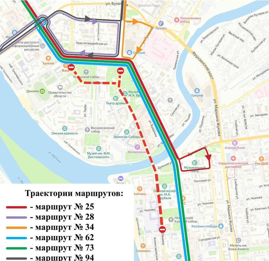 – по маршруту № 28 с моста имени 60-летия Победы по улицам Фрунзе с осуществлением остановки автобусов на ООТ «Ул. Тарская», с правым поворотом на улицу Герцена, с правым поворотом на улицу Интернациональную, далее – по утвержденной схеме, посадка пассажиров будет осуществляться на остановку «Ул. Фрунзе»;