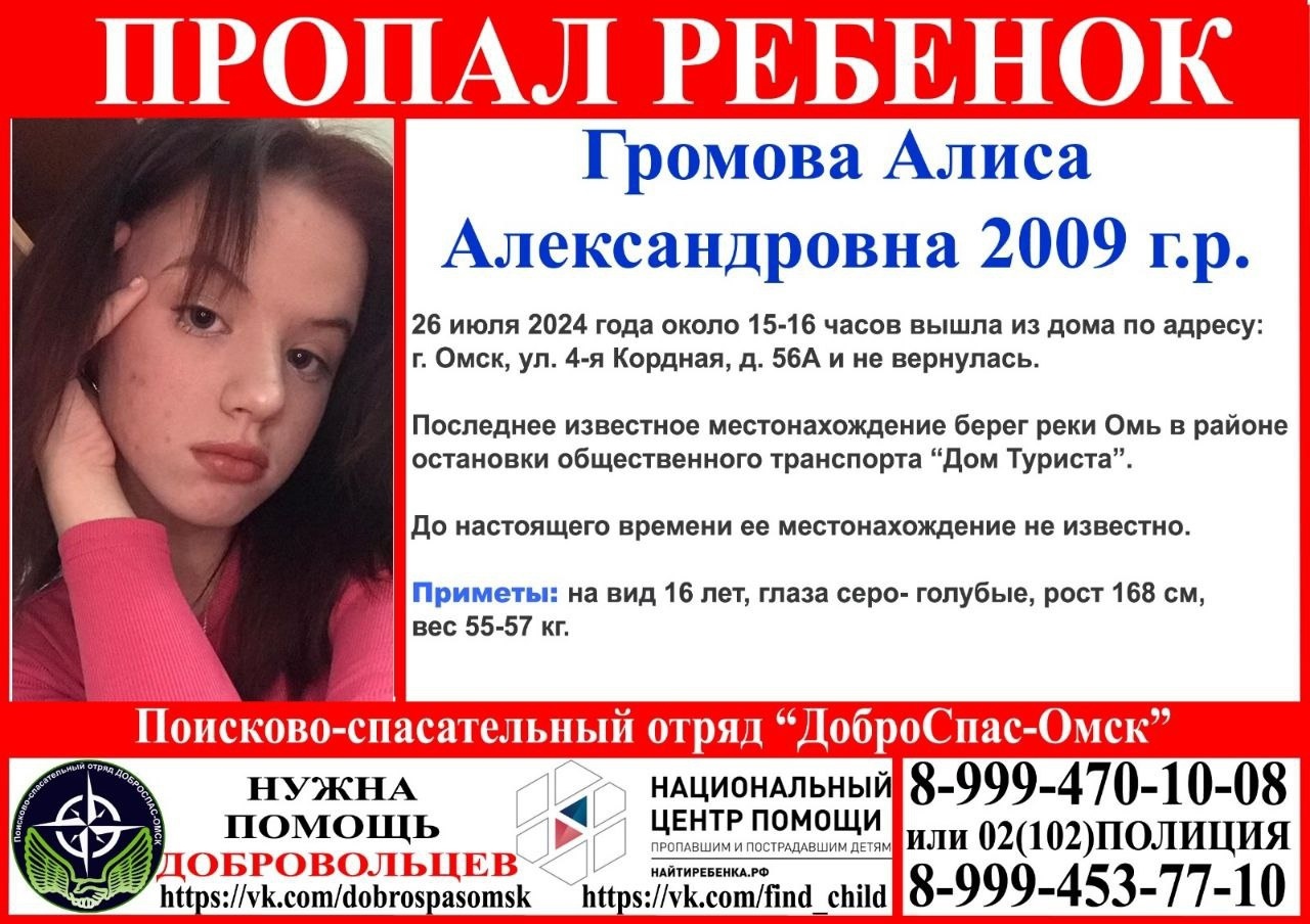 Поисково-спасательный отряд «Доброспас-Омск» сообщает о розыске 15-летней Алисы Громовой. Девочка пропала вчера, 26 июля. Между 15 и 16 часами она вышла из дома по улице 4-я Кордная и до настоящего времени не возвращалась. Последний раз Алису видели на берегу реки Омь в районе Комсомольского моста.