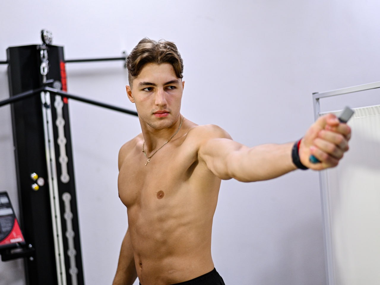 Нападающий Никита Холодилин сжимает эспандер, демонстрируя недюжинную силу кисти.