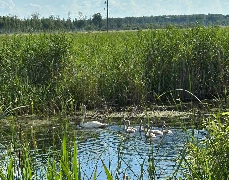 В селе Рыжково Крутинскоого района Омской области пара лебедей поселилась прямо на обочине дороги в широком кювете с водой. Пара воспитывает шестерых птенцов, пока еще совсем маленьких. Для большой семьи это весьма скромные «апартаменты».