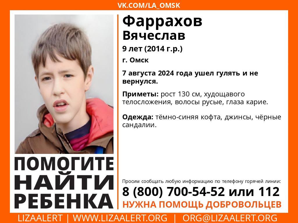 Поисково-спасательный отряд «Лиза Алерт» объявил о поисках 9-летнего школьника Вячеслава Фаррахова. Сообщается, что вчера, 7 августа, он ушел гулять и не вернулся. Со вчерашнего дня его ищут родители и полиция.