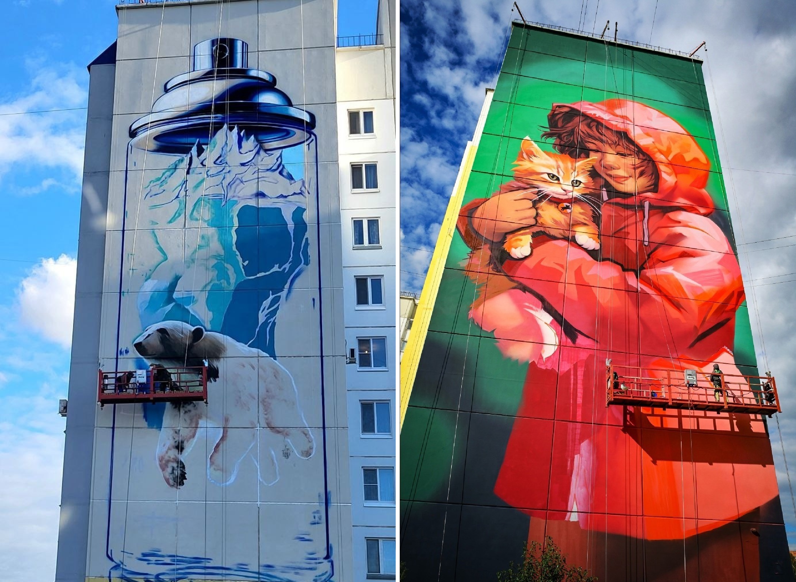 На стенах домов в омском микрорайоне «Модерн» продолжают появляться новые рисунки. Один из художников изобразил девочку с котом. Фотографиями этих граффити горожане делятся в соцсетях.