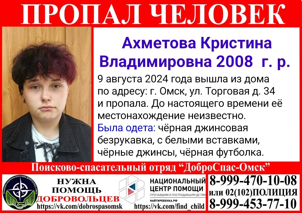 Сегодня, 28 августа, сообщество омских поисковиков «Доброспас-Омск» сообщило о поисках 16-летней Кристины Ахметовой. Сообщается, что школьница пропала несколько недель назад – 9 августа.