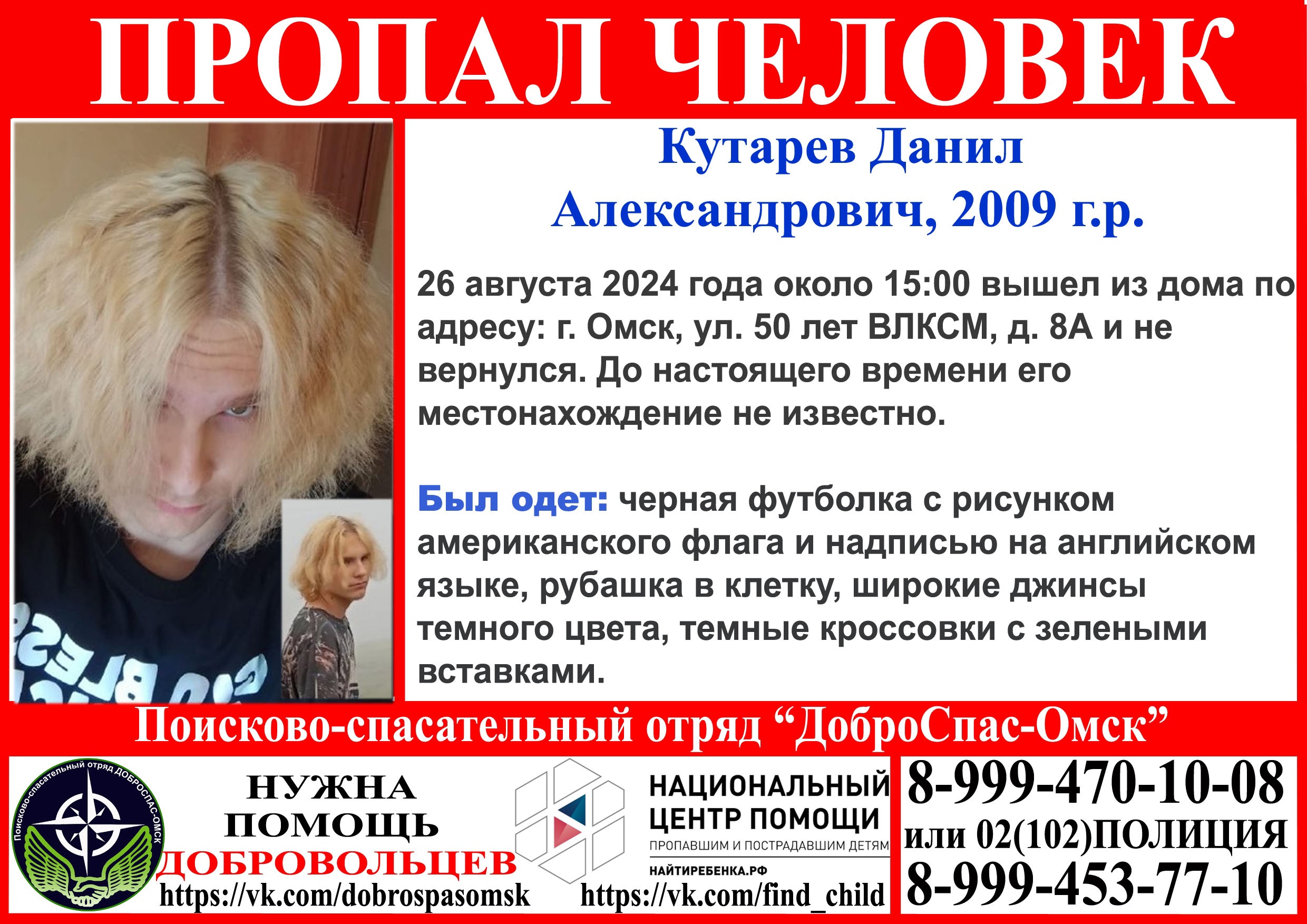 Сегодня вечером, 28 августа, омские поисковики опубликовали ориентировку на пропавшего 15-летнего Данила Кутарева. Школьник пропал два дня назад – 26 августа.