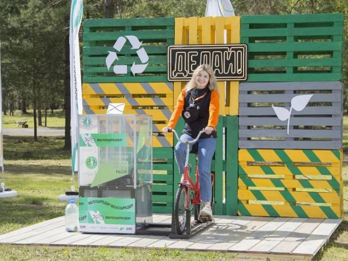 Он позволяет измельчать пластик, бумагу и картон c помощью кручения педалей.