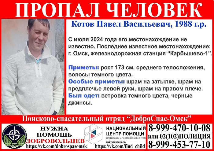 Вчера, 3 октября, в группе поискового отряда «Доброспас-Омск» опубликовали сообщение о пропаже 36-летнего Павла Котова. Мужчина перестал выходить на связь еще в июле текущего года. Последний раз его видели на железнодорожной станции «Карбышево-1».