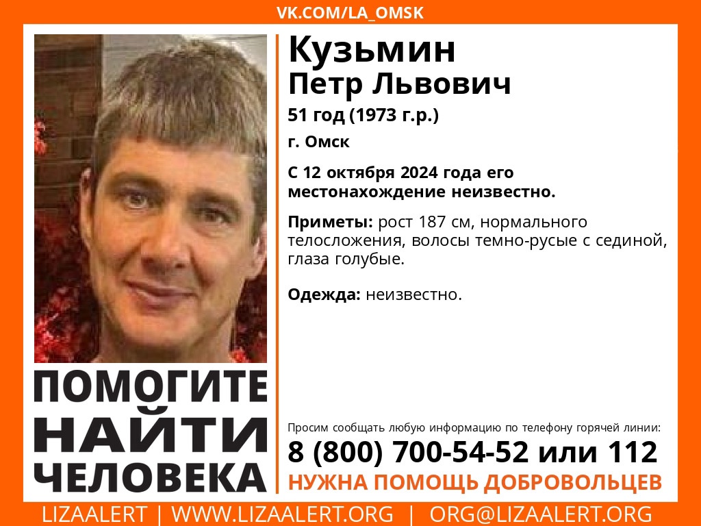 Сегодня, 22 октября, в паблике поисковиков «Лиза Алерт Омск» появилась ориентировка на 51-летнего Петра Кузьмина. Сообщается, что он пропал 12 октября, с тех пор его местонахождение неизвестно.