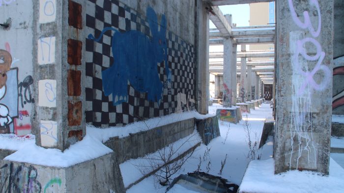 Сама заброшка огорожена неглухим забором, имеется даже пункт охраны, однако попасть на территорию не составляет особого труда. При ближайшем рассмотрении объект представляет собой унылое зрелище в самом центре Омска: полуразрушенный лабиринт с рядами обветшавших граффити.