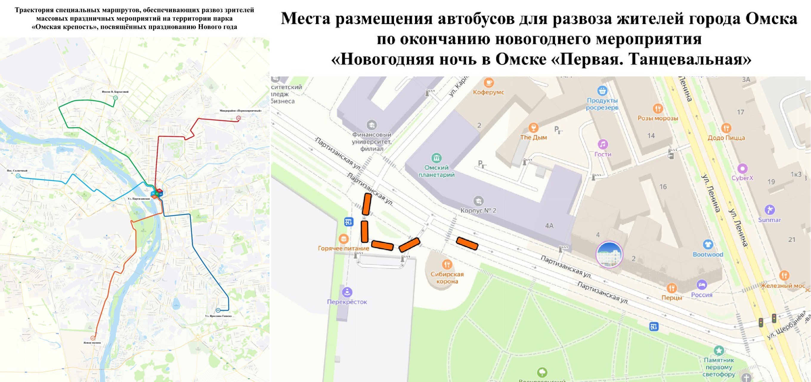 Мэрия опубликовала маршруты, по которым развезут омичей после празднования Нового года в «Омской крепости». К 2:00 1 января на улицу Партизанскую подадут 5 больших автобусов.