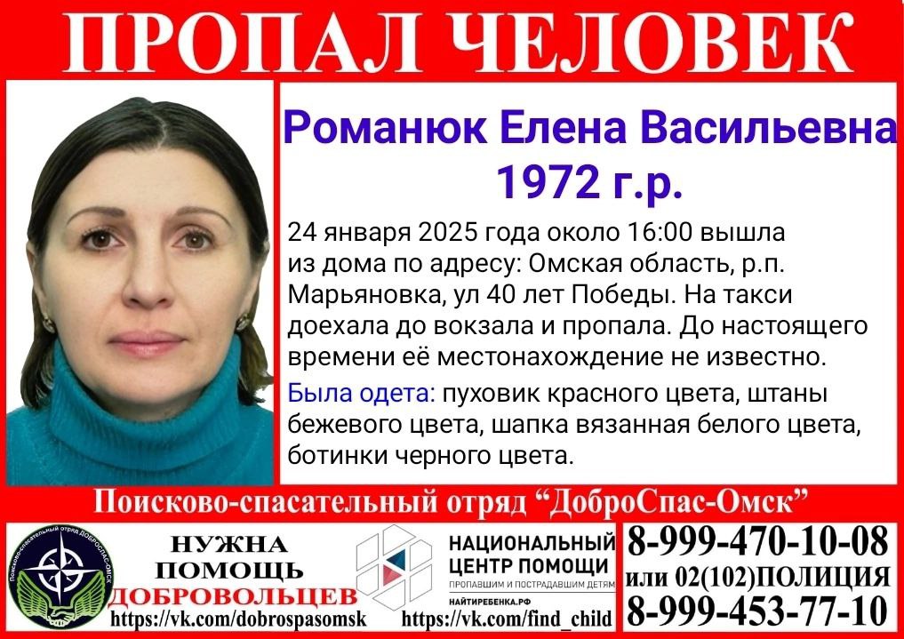 В Омской области больше недели назад пропала 52-летняя Елена Романюк. Как сообщает поисково-спасательный отряд «Доброспас-Омск», в последний раз ее видели 24 января, когда женщина ушла из дома по улице Победы в райцентре Марьяновка и села в такси, чтобы доехать до местного вокзала. Известно, что пропавшая достигла пункта назначения, но дальнейшее ее местоположение неизвестно.