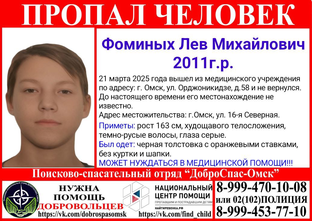 В Омске разыскивают 14-летнего мальчика. Вчера, 21 марта, Лев Фоминых покинул больницу на улице Орджоникидзе, 58, и пропал. Предположительно, он может находиться поблизости от своего дома на улице 16-я Северная.