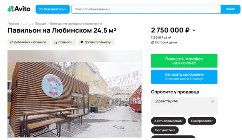На сайте «Авито» выставлен на продажу павильон площадью 24,5 кв. м, находящийся по адресу: улица Ленина, 7. Объект подключен ко всем основным коммуникациям и оборудован необходимой техникой.
