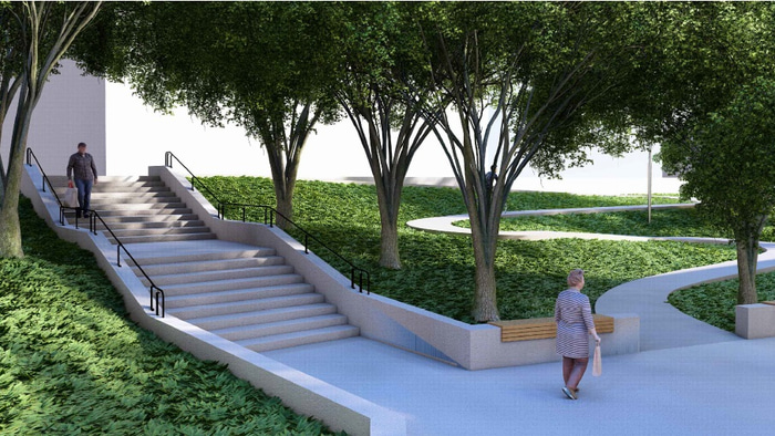 Подрядчику предстоит облицевать лестницу белым гранитом из Мансуровского месторождения, сделать дорожки и восстановить подпорные стены, установить деревянные лавочки, поставить светильники на солнечных батареях.