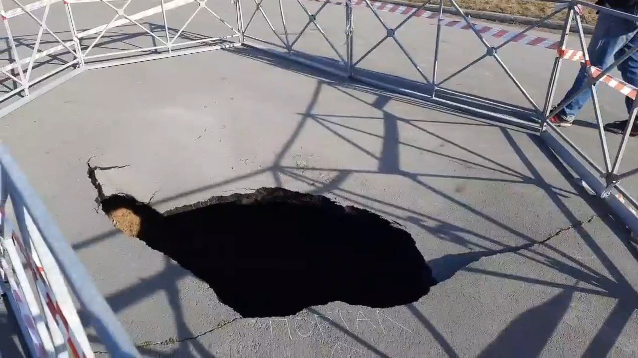 Место прошлогоднего ремонта пока остается в сохранности, но совсем рядом открылась новая яма глубиной около двух метров. Внутри нее видны мусор и вода. Трещины проходят через все ограждение и часть тротуара, создавая риск дальнейшего разрушения пешеходной зоны.