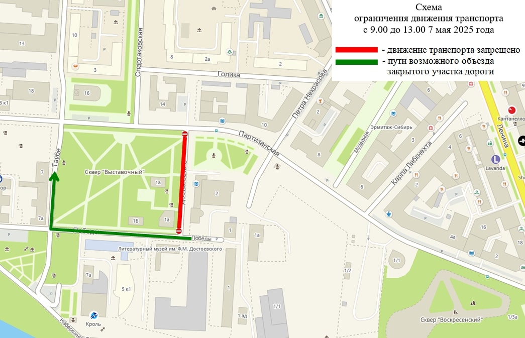 С 9:00 до 13:00 планируется перекрыть движение по улице Достоевского, на участках от улицы Победы до улицы Партизанской. Также с 8:00 до 13:00 предполагается запретить стоянку автомобилей в районе проведения мероприятий. Для объезда предлагается воспользоваться улицами Победы, Таубе и Партизанской.