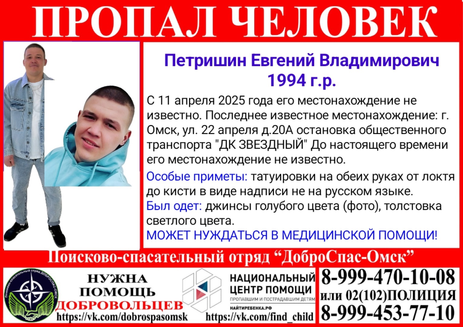 Поисковый отряд «Доброспас-Омск» вечером, 19 апреля, опубликовал ориентировку на поиски 31-летнего Евгения Петришина. Волонтеры сообщают, что молодой человек исчез более недели назад, 11 апреля.