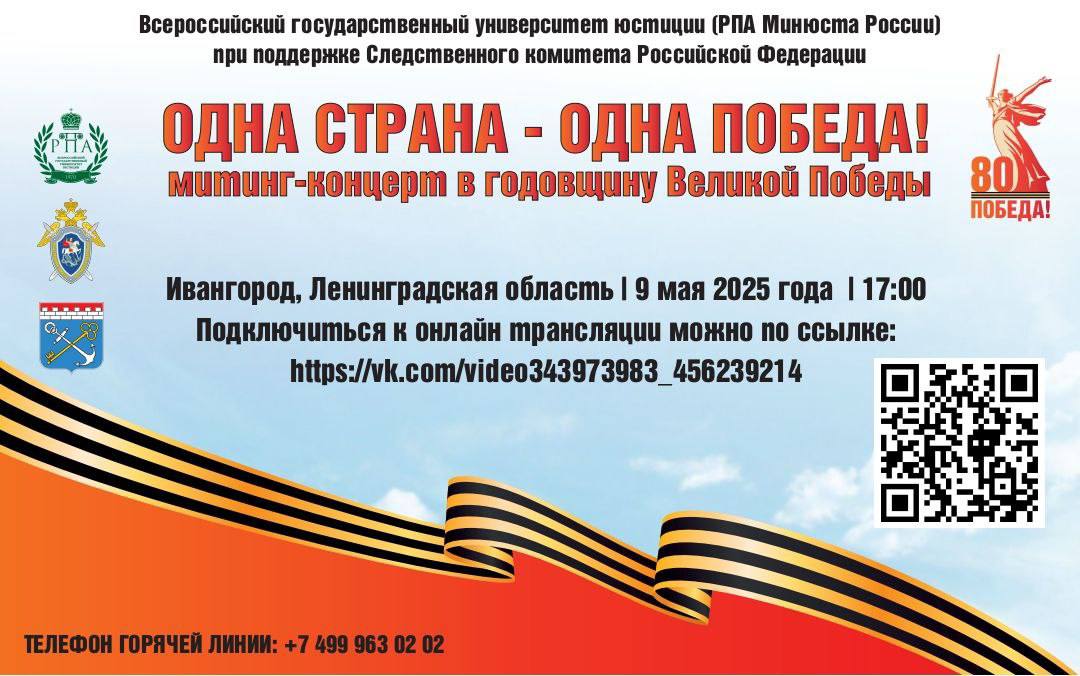 Сегодня, 9 мая, в 17:00 по московскому времни (20:00 по Омску) в Ивангороде Ленинградской области состоится митинг-концерт «Одна страна – одна Победа!». Мероприятие, организованное Всероссийским государственным университетом юстиции при поддержке Следственного комитета, будут транслировать онлайн.
