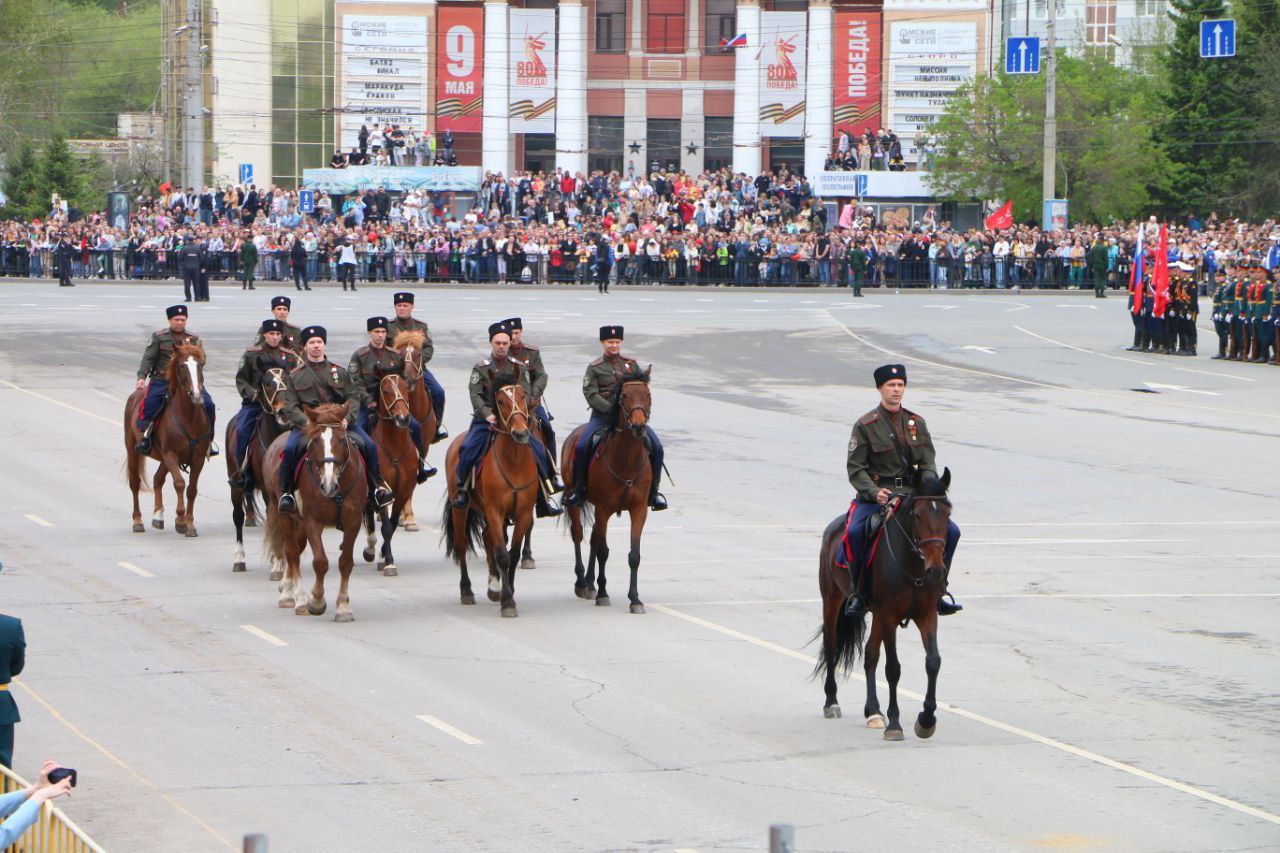 Парадное шествие началось с выноса на Соборную площадь российского флага и копии Знамени Победы. Войска приветствовал начальник Омского гарнизона, командующий 33-й Ракетной Армии гвардии генерал-лейтенант Владимир Квашин. На площадь также внесли штандарты воинских соединений и частей, в годы ВОВ сформированных в Прииртышье и прошедших боевой путь от Подмосковья до Берлина.