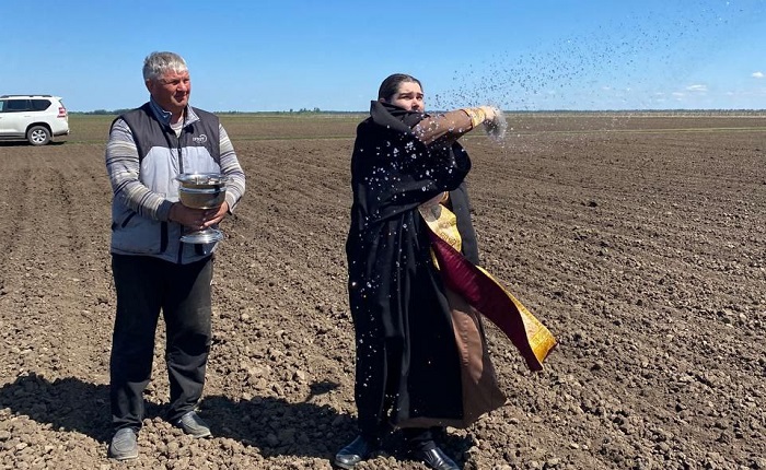Настоятель храма преподобного Серафима Саровского иерей Валентин Фомиченко послужил особый чин освящения семян, а также совершил молитву на полях предприятия, окропив их святой водой. Какие культуры растут на полях хозяйства, не уточняется.