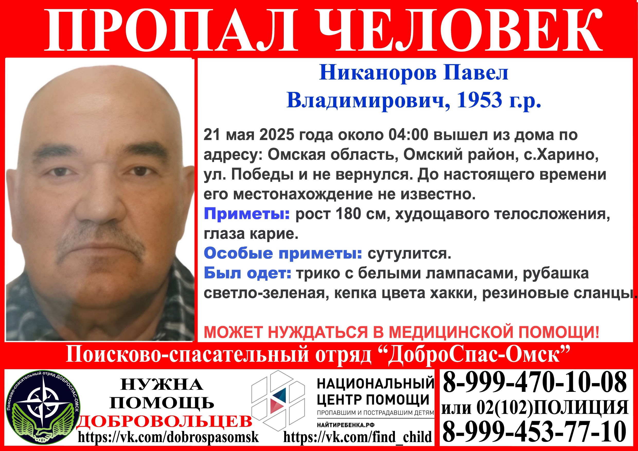 Сегодня, 21 мая, примерно в 4 часа ночи 72-летний Павел Никаноров вышел из дома на улице Победы, в селе Харино, Омский район, и не вернулся. В настоящий момент родные ничего не знают о его местонахождении.