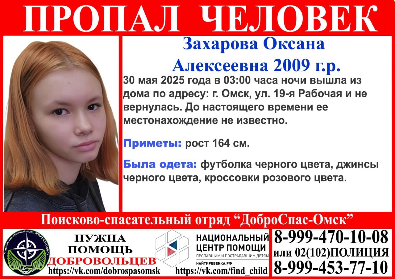 Поисковый отряд «Доброспас-Омск» сообщил об ориентировке на поиски Оксаны Захаровой, 2009 года рождения. Девушка ушла сегодня около 3 ночи из дома на улице 19-я Рабочая и до настоящего времени не вернулась.