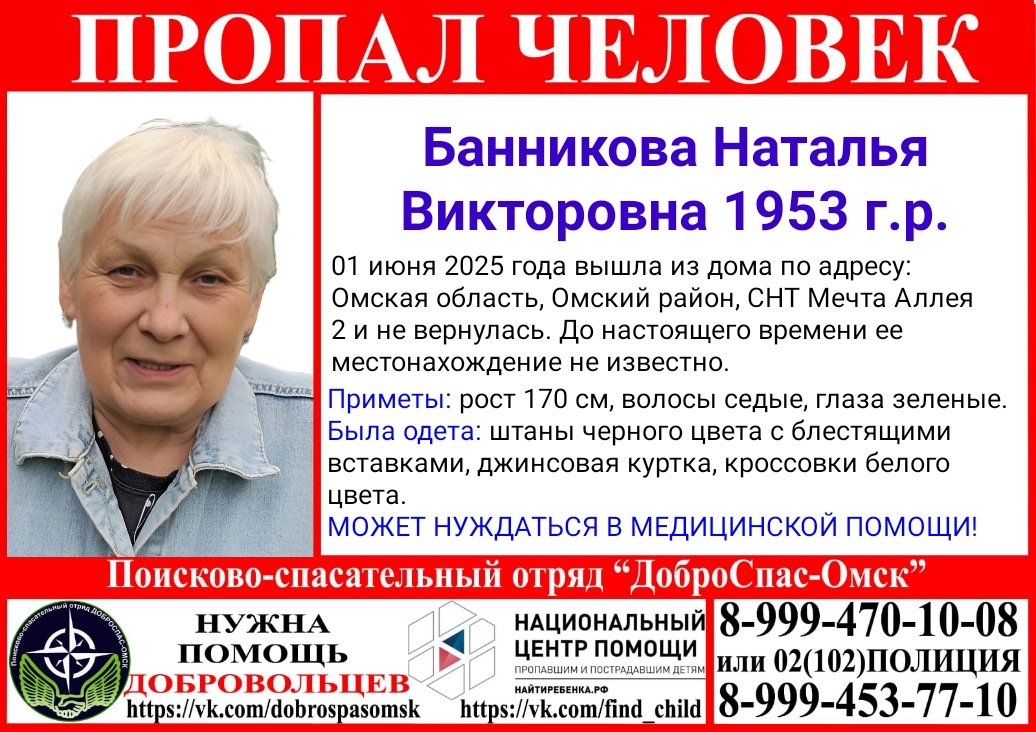 В Омске пропала 72-летняя Наталья Банникова. Как сообщает поисково-спасательный отряд «Доброспас-Омск», вчера, 1 июня, пенсионерка вышла из дома по адресу: СНТ «Мечта», аллея 2, и не вернулась.