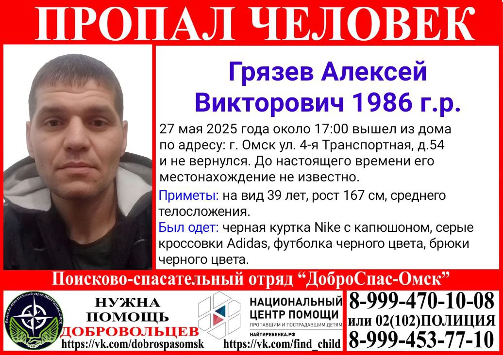 Поисково-спасательный отряд «Доброспас-Омск» объявил о поисках 39-летнего жителя Омска Алексея Грязева. Как сообщает отряд, 27 мая около 17:00 мужчина вышел из дома по адресу: улица 4-я Транспортная, 54 и до настоящего времени не вернулся.