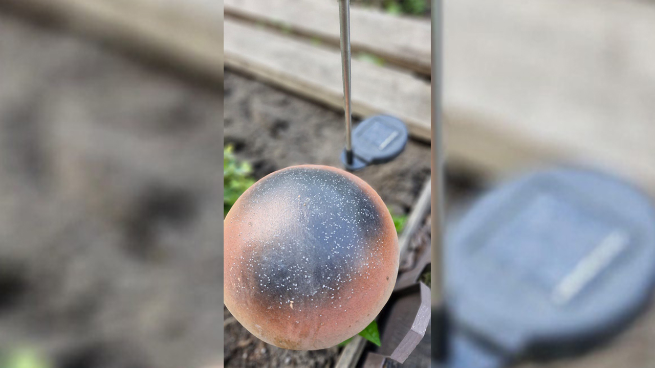 Последствия вчерашнего зарева над ТЭЦ-5 обрушились на ближайшие районы города. С утра дачники обнаружили пепел на своих участках и машинах. Декоративный гриб, находящийся на территории, буквально обгорел от осадков.