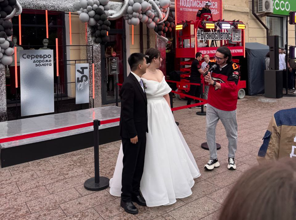 Молодожены Алиса и Андрей (у жениха, к слову, китайское имя) признались, что сбежали со своей свадьбы, чтобы попасть на мероприятие и увидеть вратаря «ястребов» Никиту Серебрякова