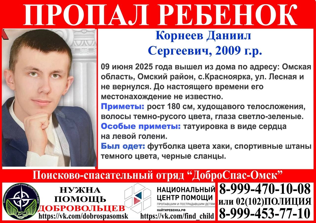 Поисково-спасательный отряд «ДоброСпас-Омск» разместил ориентировку о пропаже Корнеева Даниила, 2009 года рождения.