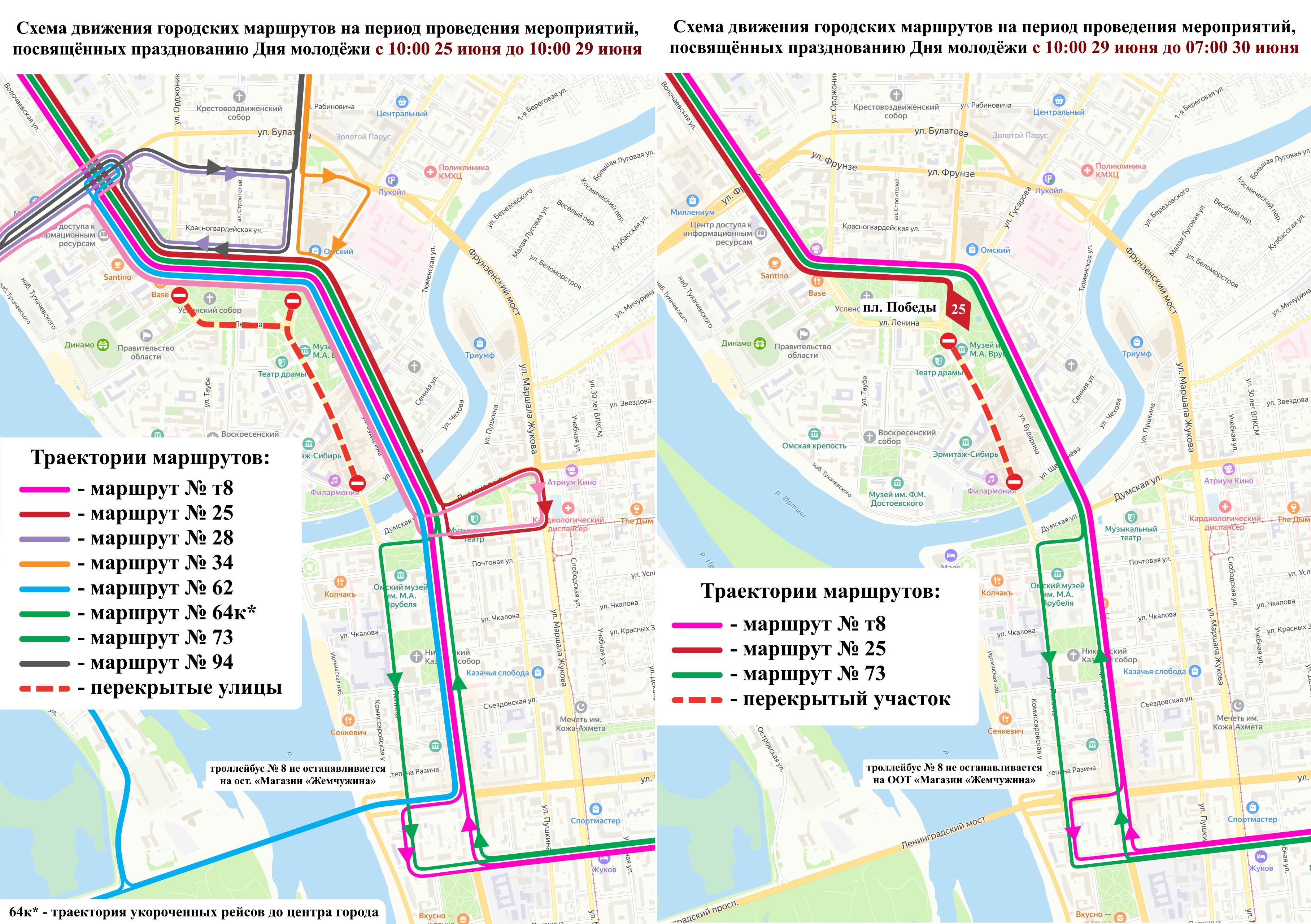 Из-за перекрытия нескольких улиц в Омске 25–30 июня изменятся маршруты общественного транспорта. Ограничения коснутся центра города, где планируется празднование Дня молодежи.