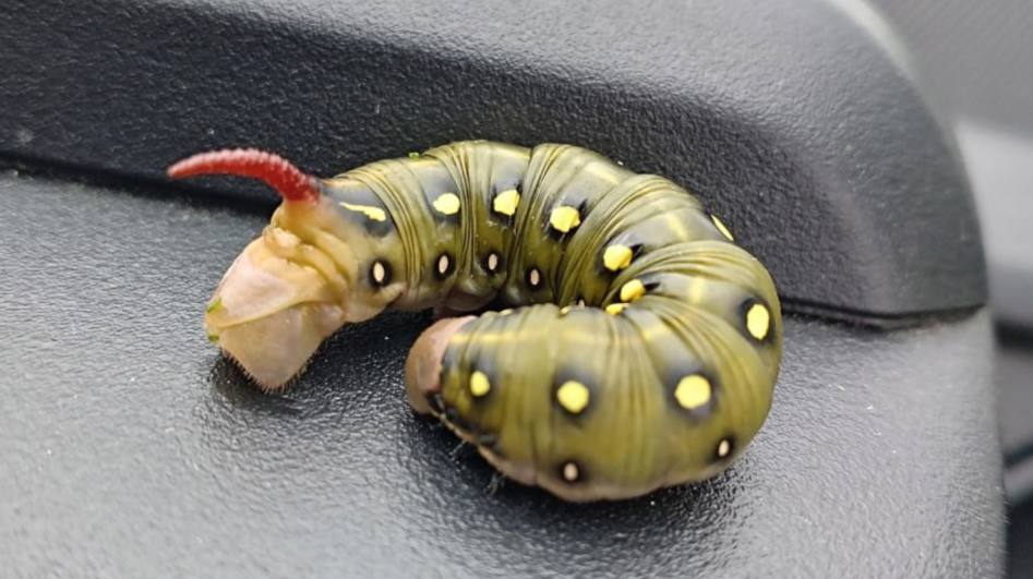 Согласно открытым интернет-источникам, гусеница принадлежит виду бражник подмаренниковый, занесенному в Красную книгу Омской области. Питается насекомое листьями растений, в том числе иван-чаем и подмаренником, распространенными сорными растениями.