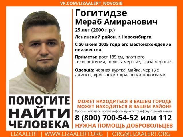 В Новосибирске ищут 25-летнего Мераба Гогитидзе. Как сообщили волонтеры поисково-спасательного отряда «Лиза Алерт», мужчина может находиться на территории Омской области. О его местонахождении ничего не известно с 20 июня.