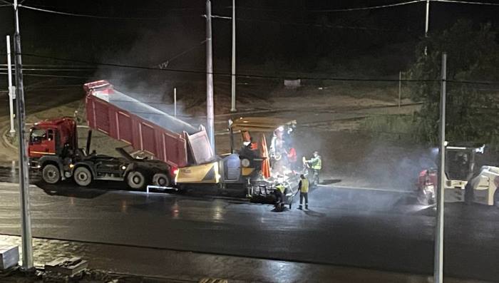 Прямо сейчас, ночью, под проливным дождем на бульваре идут работы по укладке финального слоя асфальта. В районе полуночи на участке от проспекта Комарова до улицы Ватутина неожиданно включили линию наружного освещения, которая даже не введена в эксплуатацию и до этого ни разу не запускалась. При мощном свете фонарей на ремонтируемую дорогу начали заезжать самосвалы с горячей асфальтобетонной смесью. Рассредоточившись по участку, водители стали ждать асфальтоукладчик и катки, чтобы приступить к непосредственной работе.
