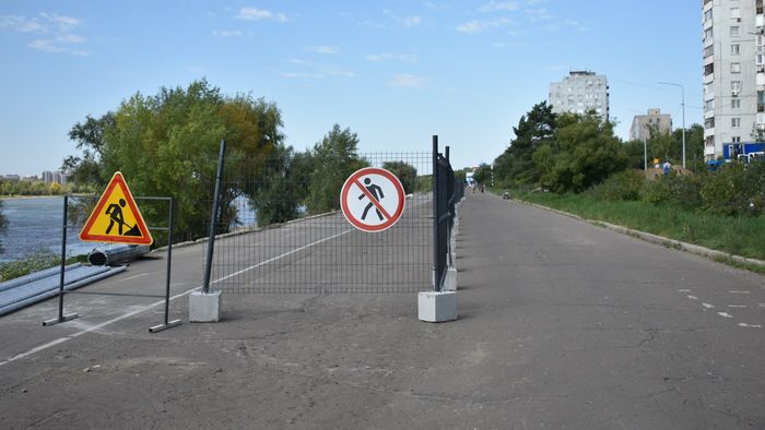 Перекрытие набережной Тухачевского в Омске постепенно расширяется. Забор от здания ГИМС МЧС (Кемеровская, 1/1) тянется вдоль береговой линии уже на 600 метров – почти до самого метромоста.