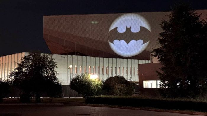Вечером на фасаде здания появился яркий световой сигнал в форме летучей мыши. На фотографии видно, как знаменитый «бет-сигнал» подсвечивает верхнюю часть комплекса.