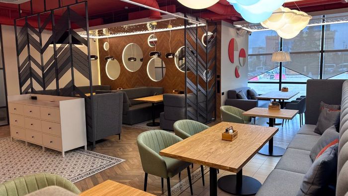Особенностью дизайна заведения станут уютная мебель и панорамные окна. В дизайне использованы натуральные материалы с оттенками древесины и терракоты.