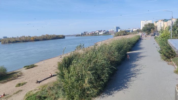 Однако через несколько десятков метров открывается совсем другая картина: вытоптанный берег, узкая тропинка вдоль камыша и кустарника, заросли, частично закрывающие вид на Иртыш. Ближняя часть пляжа у набережной выглядит неухоженной и больше напоминает дикий участок, тогда как дальше по территории располагается благоустроенная зона с чистым песком, где отдыхают люди.