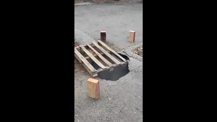 По словам местной жительницы, ранее на этом месте лежала покрышка, сигнализирующая об опасности, однако недавно дорожное покрытие ушло под землю. Теперь провал закрывает деревянный поддон. Жильцов попросили не ездить рядом с местом провала.