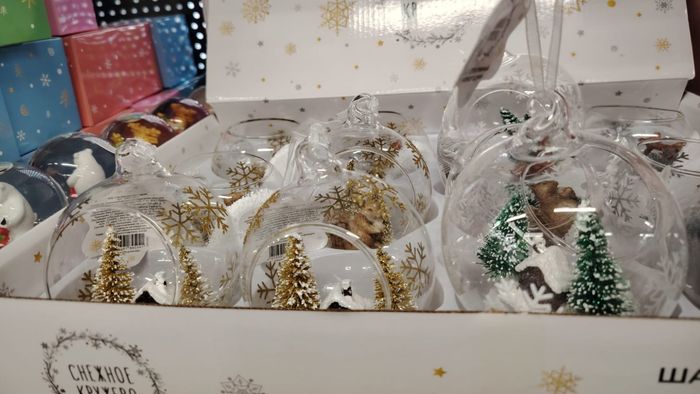 В первые дни продаж новогодних украшений горожане только присматриваются к ассортименту. Продавцы предлагают разные по форме и материалу елочные игрушки. Бывают стеклянные, пластиковые и картонные. На любой вкус и цвет.