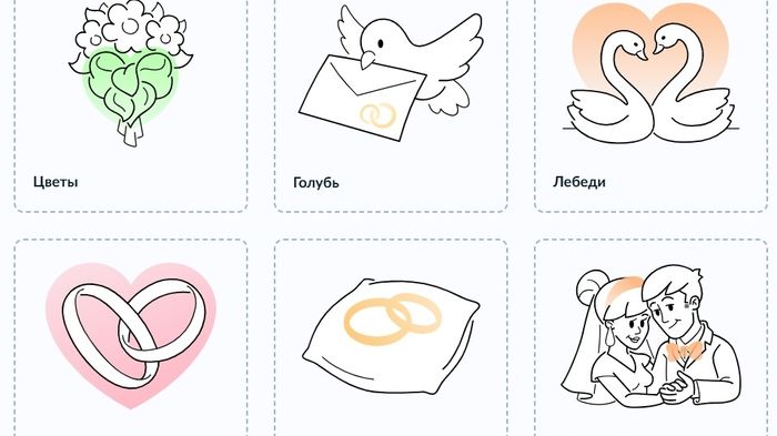 Шаблоны на выбор – «Цветы», «Голубь», «Лебеди», «Сердце», «Кольца» и прочее. Далее нужно указать дату и время события, а после разослать приглашение в мессенджеры, на электронную почту. Можно и распечатать.
