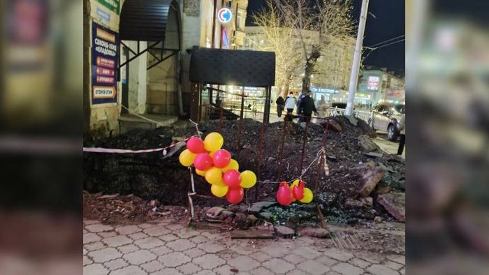 В соцсетях распространяется фотография «оригинального» украшения коммунальной ямы в городке Нефтяников. Участок, вырытый напротив КДЦ «Кристалл», украсили красными и желтыми воздушными шарами. На ограждение прикрепили большую и маленькую связки шариков.