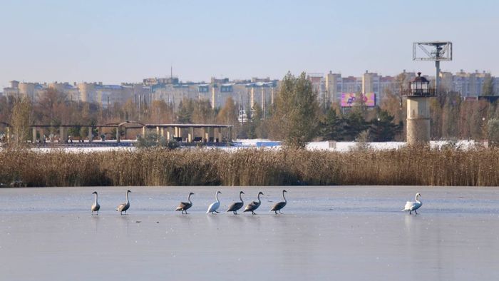 В природном парке «Птичья гавань» на Левобережье Омска можно наблюдать лебедей, катающихся по льду замерзшего водоема. Покрытая льдом водная гладь не мешает птицам готовиться к дальним перелетам.
