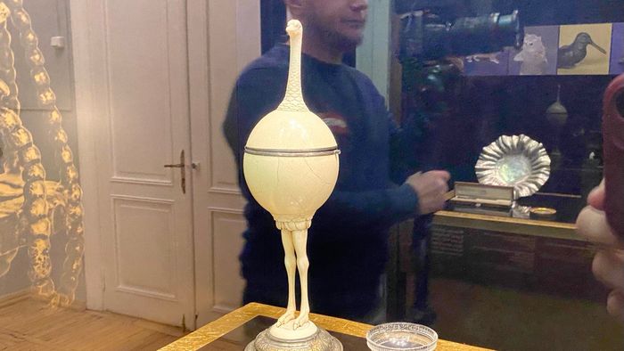 Одним из наиболее любопытных экспонатов также является сосуд-шутиха в форме страуса. Основная особенность этого сосуда заключается в том, что тело страуса выполнено из натурального страусиного яйца. Голова, шея и конечности изготовлены из слоновой кости. Оправа и основание покрыты тонким слоем серебра.