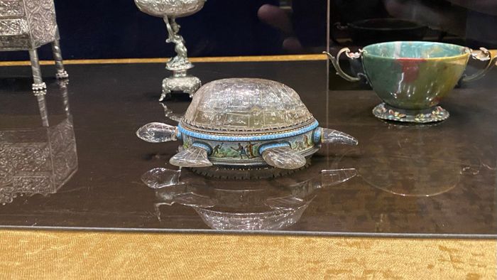 – Она выполнена из серебра и горного хрусталя. Средняя часть расписана цветными эмалями. Здесь изображены сцены охоты на морских черепах. Дело в том, что черепах сложно было поймать в воде. За ними обычно охотились, когда они выходили на сушу откладывать яйца. Они тогда становились малоподвижными и являлись легкой добычей. А как вы знаете, черепахи очень ценились. Допустим, сам корпус черепахи, панцирь, использовали как раз для изготовления очень дорогих различных элитных предметов или их отделки. Мясо черепахи использовали в пищу, – рассказал Глазов.