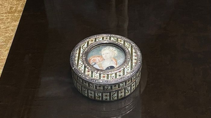 Также в витрине представлена дамская табакерка. Она сделана из папье-маше и серебра. Внутренняя часть отделки выполнена из панциря черепахи. Особенность табакерки состоит в том, что центр крышки украшен изображением женщины с раскрытой рукой, держащей черную маску. Рука выполнена отдельно и прикрепляется подвижно, так что при движении коробки женщина словно закрывает свое лицо маской.