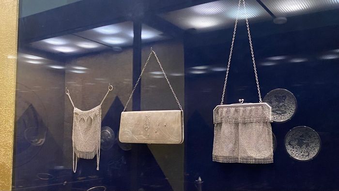 Специалист обратил внимание на три серебряные дамские сумочки конца XIX – начала XX века. Две из них созданы в уникальной технике кольчужного плетения: из тонкой серебряной проволоки изготавливались кольца, которые впоследствии переплетались друг с другом, формируя плотную структуру сумки.