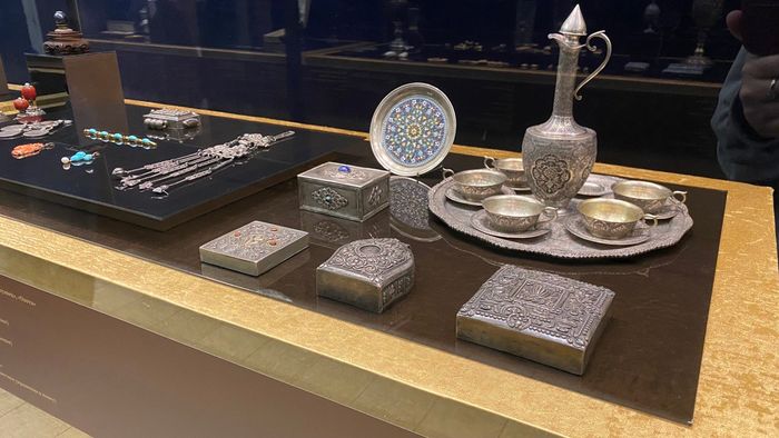 Также в этой витрине представлены кубки, бокалы, табакерки, портсигары, вазы, различные украшения: серьги, броши, кулоны и браслеты. Также там показаны разного назначения изделия из золота, серебра с различными вставками из полудрагоценных и драгоценных камней.